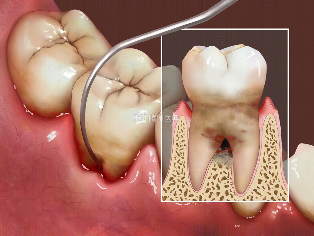 牙周炎病变蔓延至多根牙的根分叉区,牙菌斑、牙石堆积引起牙槽骨轻微吸收是该病前期最典型、最主要的症状。病情早期不易发现,随着病情进展,会出现牙齿松动,出血等症状,病变部位可有炎症和脓性分泌物。最终导致牙齿脱落。