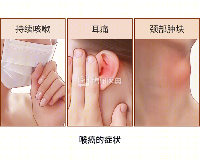 大多喉癌都是由于出现症状而被发现的,常见症状包括声音改变、声音嘶哑、喉咙痛持续不缓解、持续咳嗽、吞咽时疼痛或吞咽困难等。
