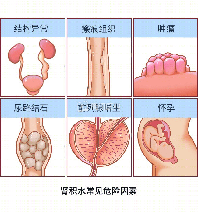 当尿路发生堵塞或出现膀胱输尿管反流,肾脏的尿液无法正常排出,就会造成肾积水。临床高危因素主要是各种原因导致的尿路梗阻、损伤或先天性的结构和功能异常。