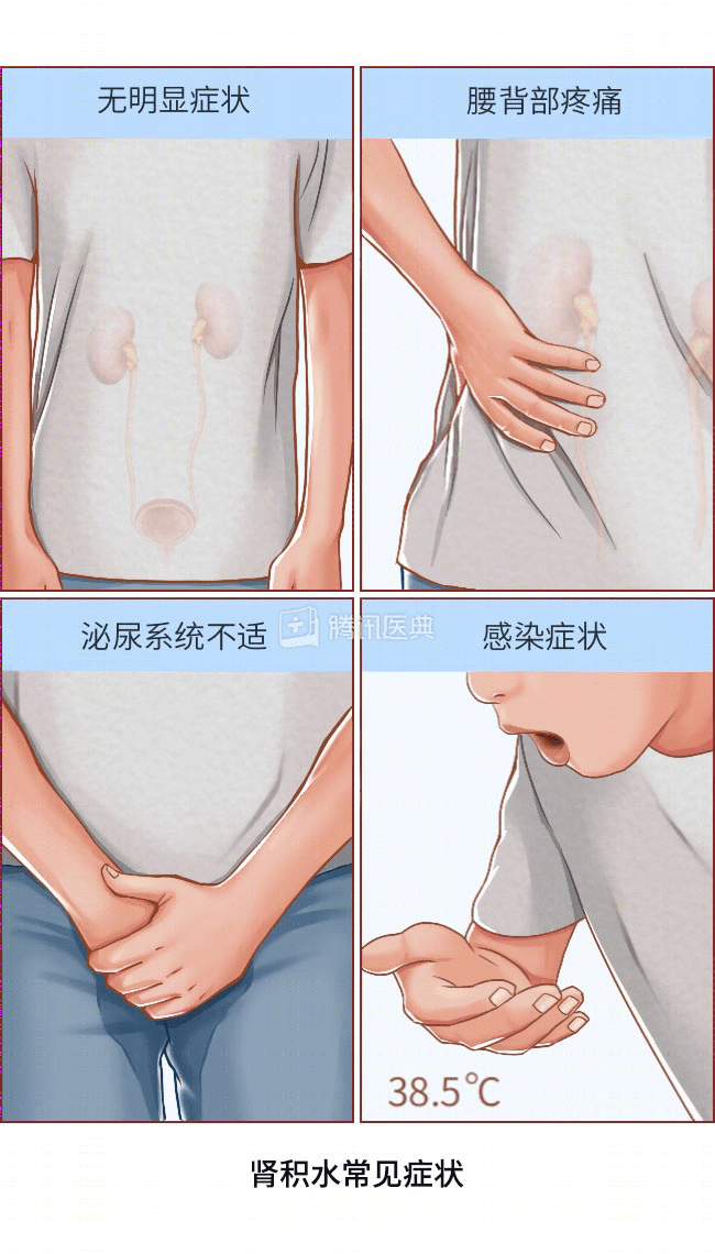 部分肾积水患者没有明显症状,其他患者的主要症状包括腰腹部疼痛、尿路刺激症状、全身性的不适,以及影响患儿的正常生长。若未经及时治疗,可继发尿路感染,并可能破坏肾脏结构和功能,甚至进展为肾衰竭。